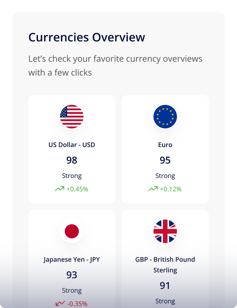 See relative strength across all major currency pairs with clear directional bias for optimal pair selection.